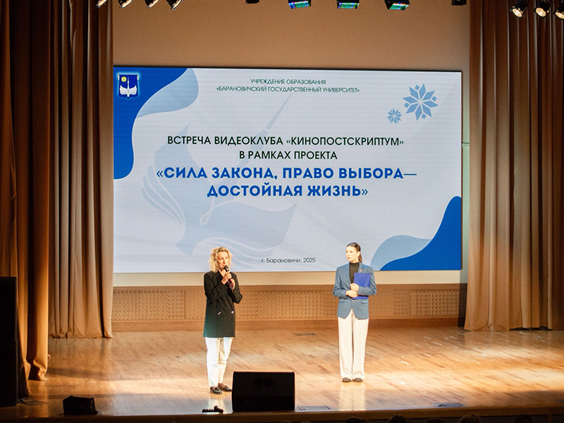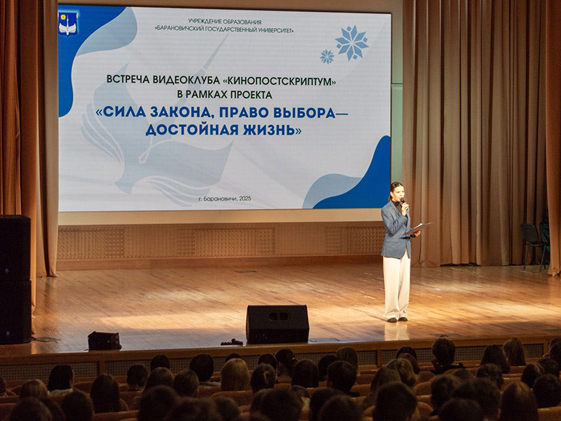В актовом зале отдела культуры и творчества учреждения образования «Барановичский государственный университет» состоялась встреча видеоклуба «Кинопостскриптум», которая объединила студентов первого курса всех факультетов. Мероприятие прошло в рамках проекта «Сила закона, право выбора — достойная жизнь», направленного на правовое просвещение и формирование осознанной гражданской позиции у студенческой молодежи.