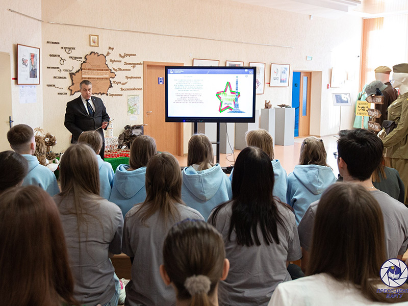 Экскурс в экспозиционном уголке «Забвению не подлежит» провел заведующий кафедрой общеправовых дисциплин и государственного управления, кандидат исторических наук Анатолий Викторович Демидович. В ходе экскурса были освещены ключевые события военного времени, трагедия белорусского народа и важность сохранения исторической правды для будущих поколений.