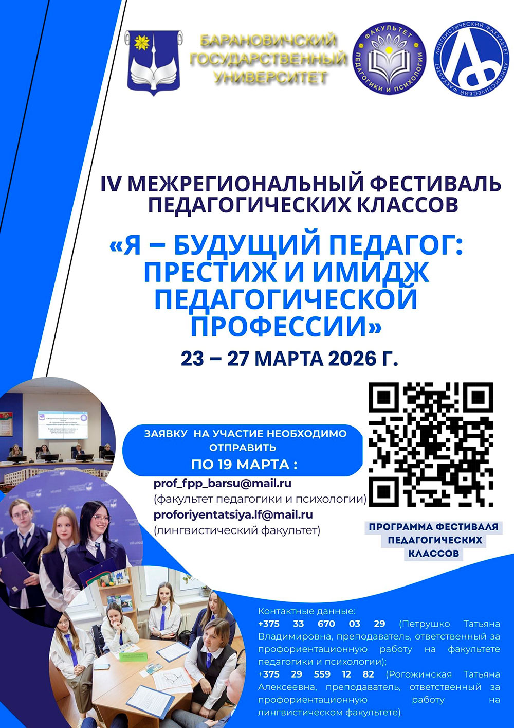 В рамках фестиваля учащимся предоставляется возможность познакомиться с педагогическими специальностями факультета педагогики и психологии, лингвистического факультета учреждения образования «Барановичский государственный университет», при поступлении на которые выпускники педагогических классов и групп педагогической направленности зачисляются без вступительных испытаний.