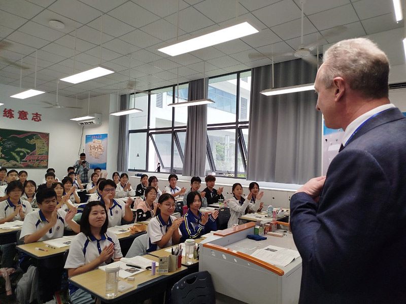 Делегация БарГУ посетила среднюю школу «Хуанган Мэйюань» (Huanggang High School). В ходе визита состоялась обстоятельная беседа с администрацией школы, в ходе которой стороны обсудили актуальные подходы к профильному обучению и подготовке абитуриентов. Ректор А.Н. Унсович провел профориентационную встречу с учениками старших классов, подробно рассказав об образовательных программах БарГУ, преимуществах обучения в Беларуси и перспективах, которые открываются перед выпускниками университета.